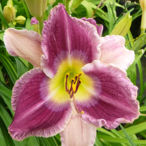 Height 33 inches (84 cm), bloom 6 inches (15 cm), season EM, Dormant, Tetraploid, 22 buds, 4 branches, Purple with a darker purple eye and a large pale lavender edge.