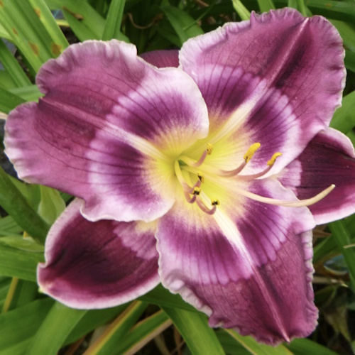 Height 28 inches (71 cm), bloom 7 inches (17 cm), season M, Rebloom, Semi-Evergreen, Diploid, Fragrant, 18 buds, 3 branches, Maroon purple with a tricolor eyezone of maroon purple, lighter purple and white, pattern repeated on sepals and edge, green and white throat.