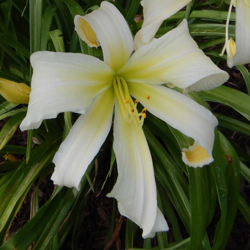 Height 59 in.(150 cm), bloom 7 in.(18 cm), season E, Dormant, Diploid, Fragrant, 43 buds, 3 branches, Unusual Form Cascade, Pale yellow diamond dusted with little ruffled above extended green throat.