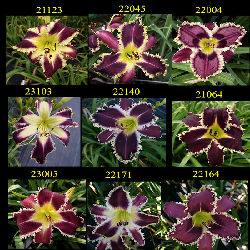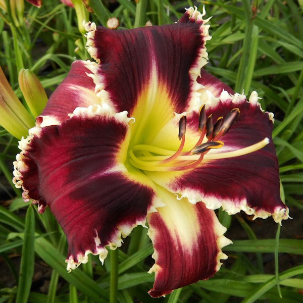 Height 36 inches (91 cm), bloom 7 inches (17 cm), season M, Dormant, Tetraploid, 15 buds, 4 branches. Beautiful wine colored flower with a darker eye. A prominent light yellow toothy edge surrounds the petals. Easily pod and pollen fertile and an outstanding parent for dark toothy flowers. You can see a few of them in the second picture. If a hybridizer tells you this is a flower to try if you are hybridizing then you should give it a try. I'm saying that about this flower. Give it a try.