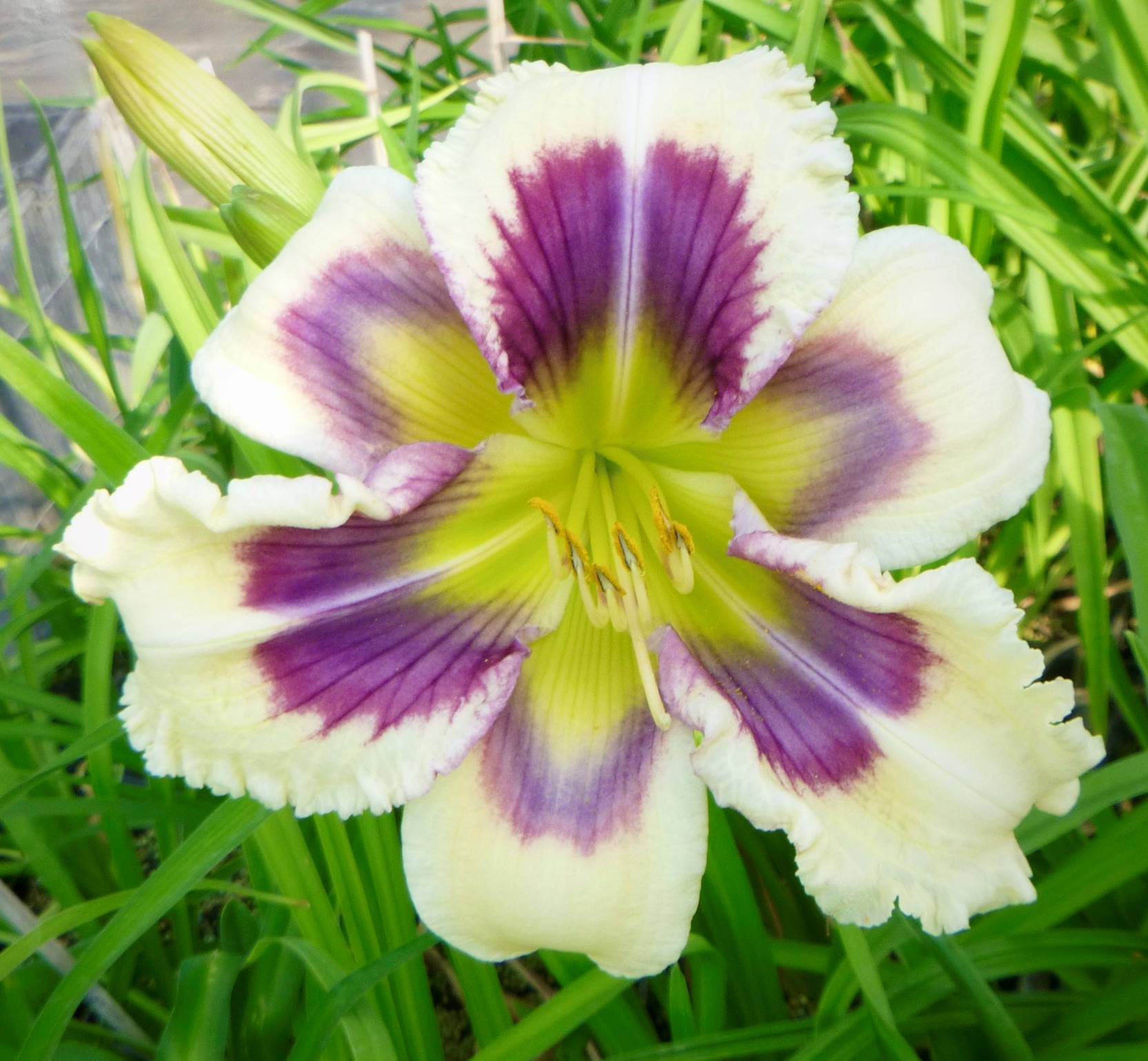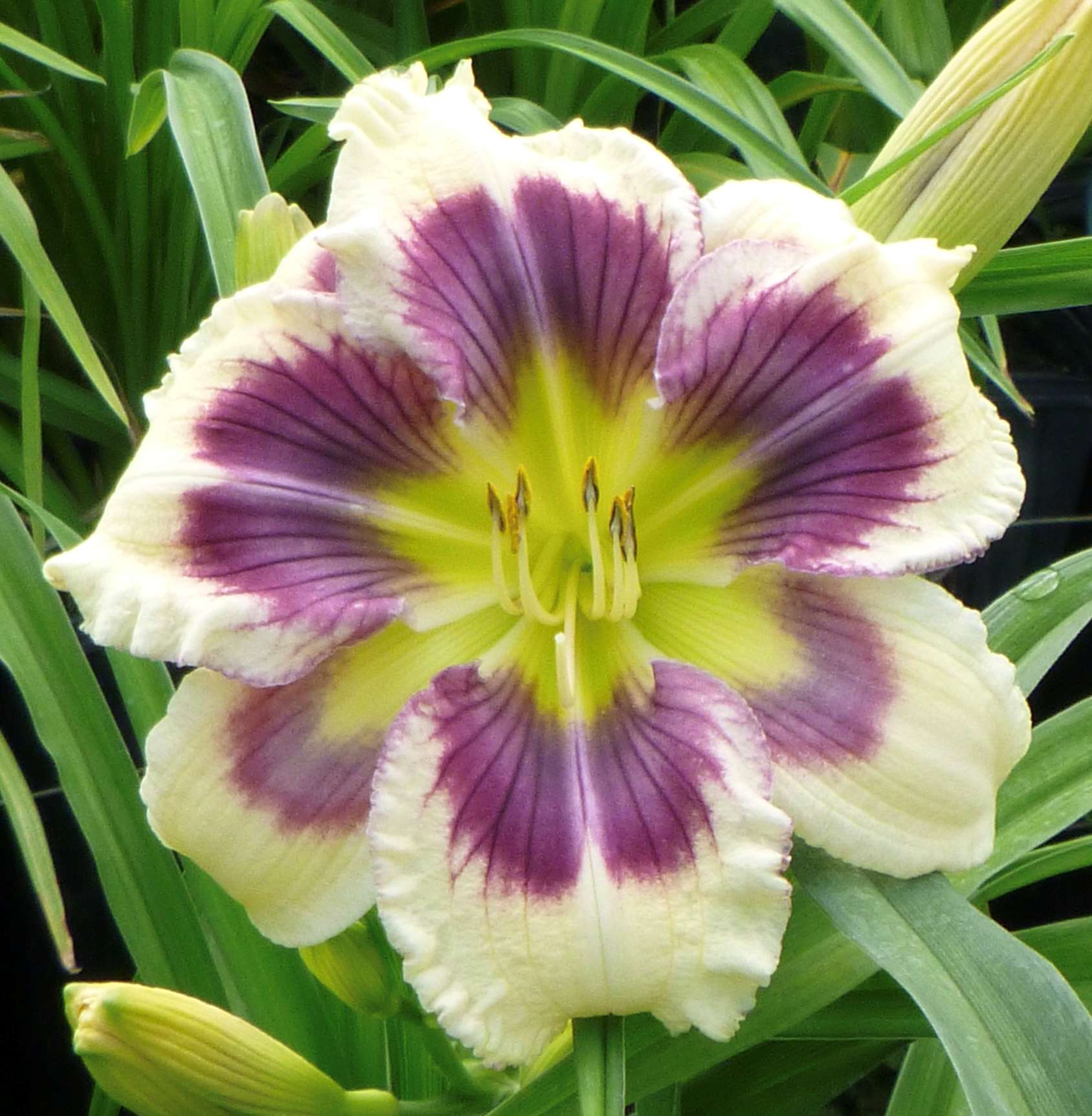 A beautiful patterned poly with instant rebloom! Ivory with purple patterned veined eye and yellow-green throat. Petals have a ruffled edge with lavender pigment near the base. Polymerous ~55%.